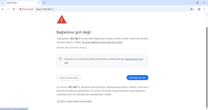 - Bizi karşılayan sayfada, ''Gelişmiş'' sekmesine tıkladığımızda; sayfanın altında ''192.168.1.1 sitesine ilerle (güvenli değil)'' uyarısına tıklayarak cihaz arayüzüne giriş sağlıyoruz. (Şekil 2.1)