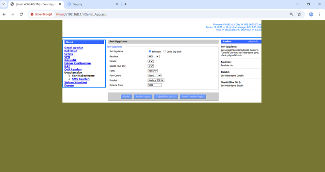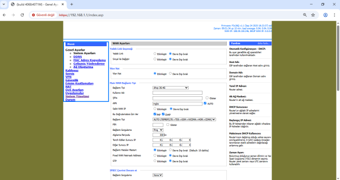 - Web arayüzünde “Genel Ayarlar” kısmına girerek “Sistem Ayarları” sekmesine tıklıyoruz. Bu kısım cihazımızla ilgili ana ayarları yapılandırdığımız yerdir (Router IP, DHCP, APN, PING, Saat, Tarih vb.).