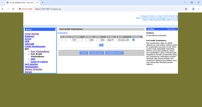 “Port Aralık Yönlendirme”de ise bir aralık belirterek, o aralıktaki bütün portlara erişim sağlanır (start port-end port).