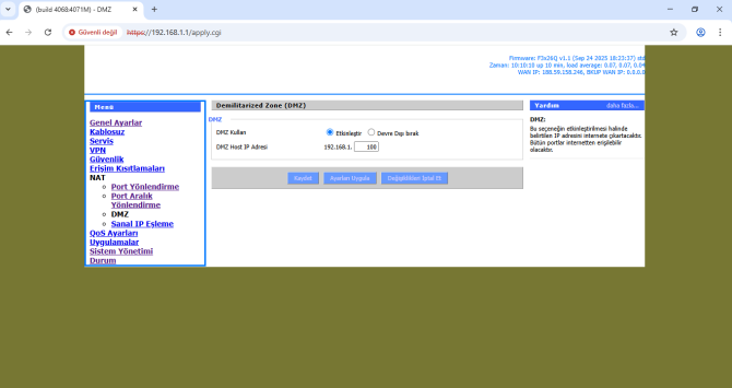 - Bu bölüm diğer uygulamalara kıyasla biraz daha geneldir. Öncelikle DMZ’yi “Enable” yapıyoruz.