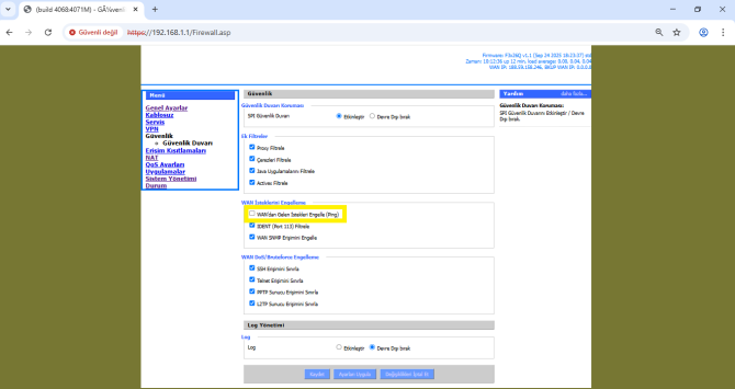 “WAN'dan Gelen İstekleri Engelle (ping)” kutucuğunu şekilde görüldüğü gibi devre dışı bırakmak gerekmektedir.