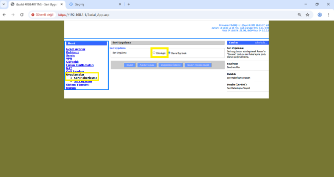 - Ayrıca seri haberleşmenin çalışabilmesi için SIM kartınızın Sabit (statik) IP özelliği olması gerekmektedir. Değişken IP’li hatlar ile IP’nizi geçici olarak kontrol ederek yapılacak denemeler dahi başarısız olacaktır.