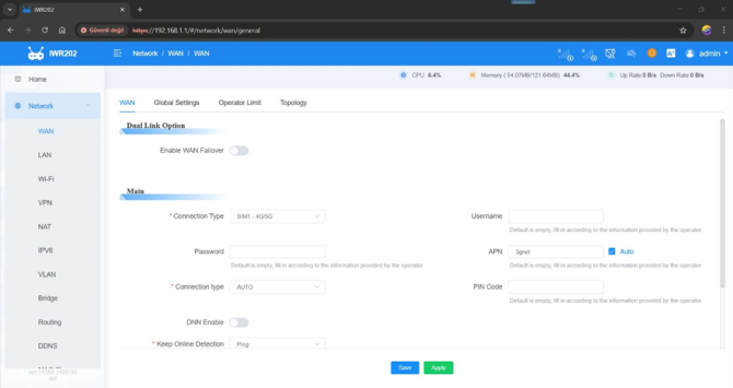 Otomatik Apn sistemi bulunur. Herhangi bir operatöre ait sim kartı taktığınız da otomatik apn alır ve modeminiz online olur. Sim kartınız da pin kodu var ise ekranda PIN Code yazan yere pin kodunuzu yazmalısınız. Bizim tavsiyemiz eğer pin kodunuz var ise sim kartı bir cep telefonuna takıp pini kaldırmalısınız. İlerde daha sonra uzaktan işlem yapmak istediğnizde size kolaylık sağlayacaktır. Farklı bir ayar yapmak isterseniz veya Özel apn li sim kart kullanacak iseniz buradan Auto tikini kaldırarak APN kısmına özel apn e ait bilgileri yazabilirsiniz. Bazı özel apn lerde kullanıcı adı ve şifresi bulunur. Username ve Password yazan yerlere yazmalısınız.