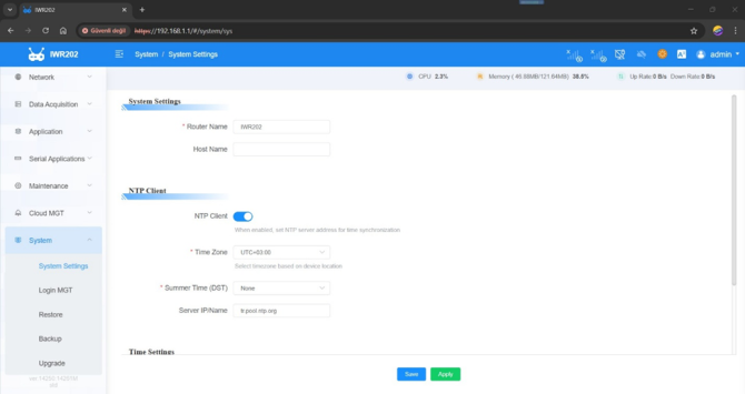 System / System settings ekranında Router Name ve Host Name ataması işlemi yapılabilir. Ayrıca NTP Client ayarlarıda yapılır. Fabrika ayarında otomatik olarak ayarlı gelir. Zamanı “tr.pool.ntp.org” adresinden alacak şelikde ayarlıdır. Özel apn kullanımlarınız da bu kısımı özel apn e ait ntp servera uyarlamanız gerekir. Aksi taktirde modemin zamanı güncellenmeyecektir. Manuel olarak da zaman ayarını bu sayfadan uyguluyoruz.