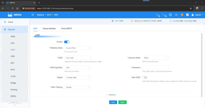 Wifi ile ilgili ayarlar bu ekrandan yapılmaktadır. Access Point veya Client mode olarak ayarlayabilirsiniz. ADSL modeme wifi ile client olarak bağlayabilir ve internet erişimini wifi üzerinden sağlayabilirsiniz.