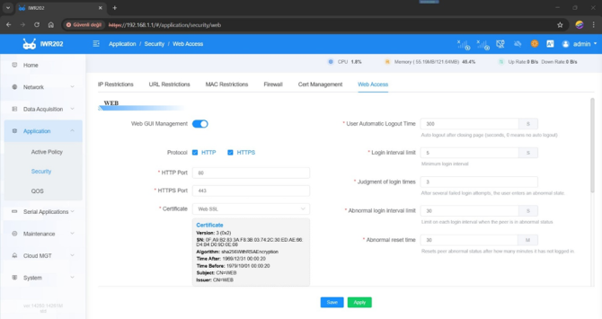 Bu ekran modem web arayüzüne erişmek için gerekli ayarların yapıldığı ekrandır. Fabrika ayarında stnadart ayarlı olarak gelir. Https ve Http aktifdir. Http port:80 Https port:443 standart ayarlıdır. Web SSL sertifikası da bu ekranda yüklüdür. Gerekli durumda buradan web arayüz erişim portlarını değiştirebilirsiniz