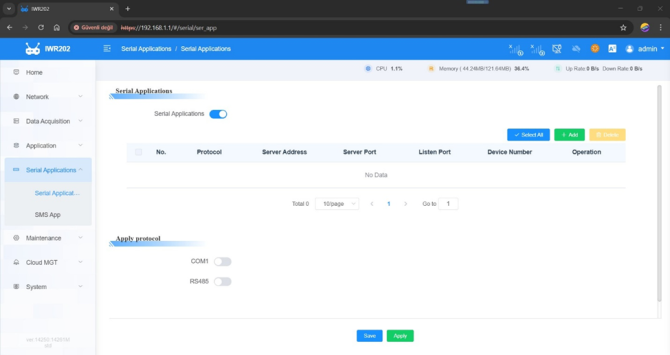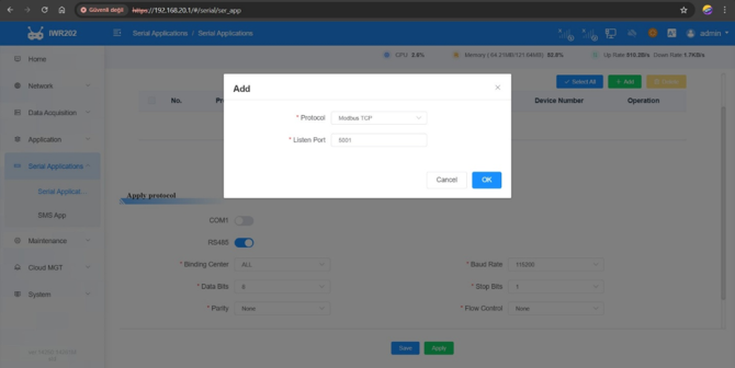 Yukarıdaki görseldeki gibi RS485 ayarları aktif ederek Baudrate ayarlarını modeme bağlanacak olan RTU cihazının ayarlarına uygun olarak yapınız. Add (yeşil olan) sekemye tıklayarak TCP Port ayarlarını yapınız. Örnekte 5001 portu açılmıştır. RTU dan gelen veriler modemin statik ip si üzerinde 5001 portuna Modbus TCP olarak aktarılmıştır.