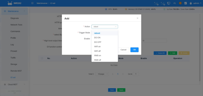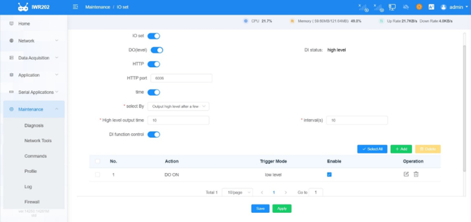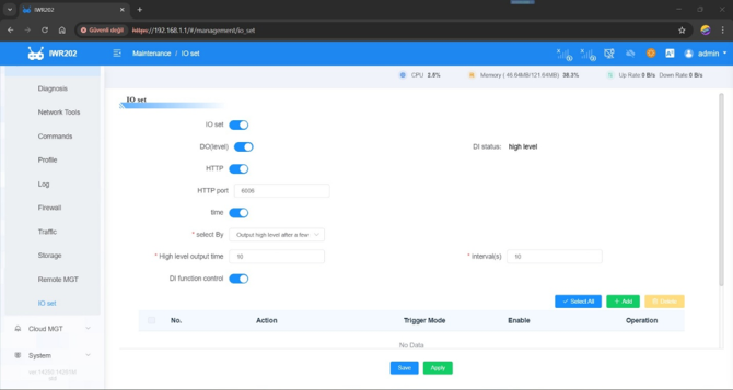 I/O settings işlemleri bu ekrandan yapılmaktadır. IO Set aktif edilerek DO ve DI ayarları yapılır. DI status Digital input un durumunu gösterir.