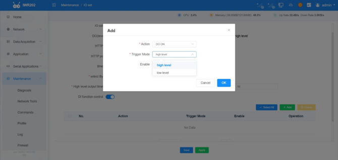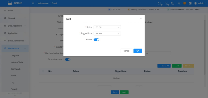 Yukarıdaki görselde DI function control kısmına DI low level olarak yani sıfıra çekildiğinde tetiklenecek bir fonksiyon oluşturuldu. Fonksiyon devreye girdiğinde DO ON durumuna geçecek yani high level olacak. Diğer fonksiyonlarıda aynı şekilde ayarlaya bilirsiniz.