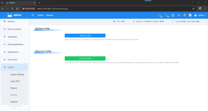 Bu ekranda Backup Config ve Recovery Config işlemleri yapabiliriz. Backup Config (mavi olan ) sekmeye tıkladığınızda modem de mevcut olan ayarların yedeğini bilgisayarınıza indirebilirsiniz. Daha sonra bu backup dosyasını gerektiğinde modeme tekrar yüklemeniz gerektiğinde veya aynı ayarlara sahip aynı model ve firmware e sahip başka bir modeme yüklemek için Recovery Config (yeşil olan) sekmeye tıklayarak mevcut olan backup dosyasını yükleyebilirsiniz.