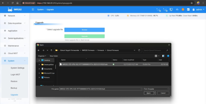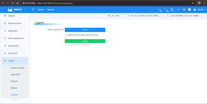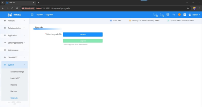 Bu ekranda modeme güncel veya farklı bir firmware sürümünü yükleyebiliriz. Browser sekmesine tıklayarak yüklemek istediğiniz firmware’i seçiniz. Dosya seçme işlemi tamamlandığında Upgrade sekmesine tıklayınız ve firmware'in yüklenmesini bekleyiniz.